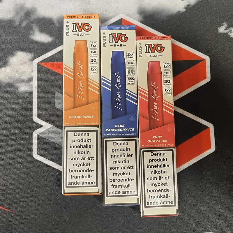 IVG Bar Plus+ är en ny engångsvape från välkända IVG Liquids. Dom har gjort sig ett namn i vapevärlden genom sina e-juicer. Engångsvapen IVG Bar Plus 600 har ett blandningsförhållande på 50% VG (vegetabiliskt glycerin) och 50% PG (propylenglykol), smakaromer av bästa kvalitet och nikotinsalt.